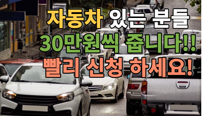 요즘 기름값이 너무 올라서 고민이 참 많습니다. 누군가가 30만 원 기름값을 지원해준다면 어떨까요? 정부에서 자동차가 있는 분들을 위한 지원금을 1인당 30만 원 지급합니다. 신청을 안 하신 분들이 있다면 잘 살펴보시고 꼭 신청하셔서 혜택 받으시길 바랍니다.