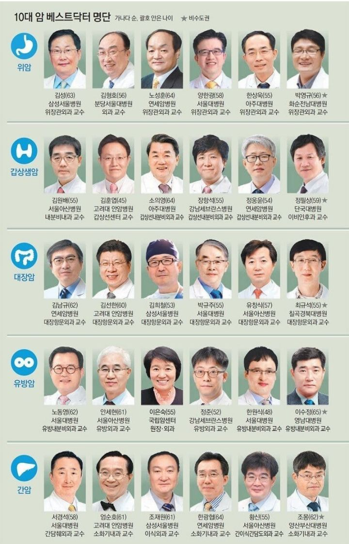대한민국 10대 암 베스트 닥터 명단입니다. 가나다 순이며 괄호 안은 나이를 표기했습니다.