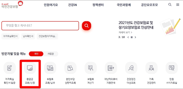 국민건강보험 홈페이지 접속 ➡️ 환급금 조회/신청 ➡️ 카카오톡, 네이버, 패스 등 간편인증 또는 금융인증 ➡️ 환급금 조회 및 신청이 가능합니다.