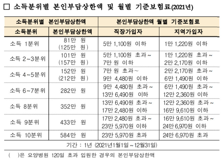 본인부담 상한액은 건강보험료 납부 금액에 따라 각 소득 분위 별 상한액이 나누어져 있습니다. (본인부담상한액의 괄호 안의 금액은 요양병원에 120일 이상 입원한 경우 본인부담상한액 입니다.)