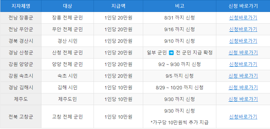 | 전남 장성군 | 장성 전체 군민 | 1인당 30만원 | 9/16일 까지 신청 | 신청바로가기 |
