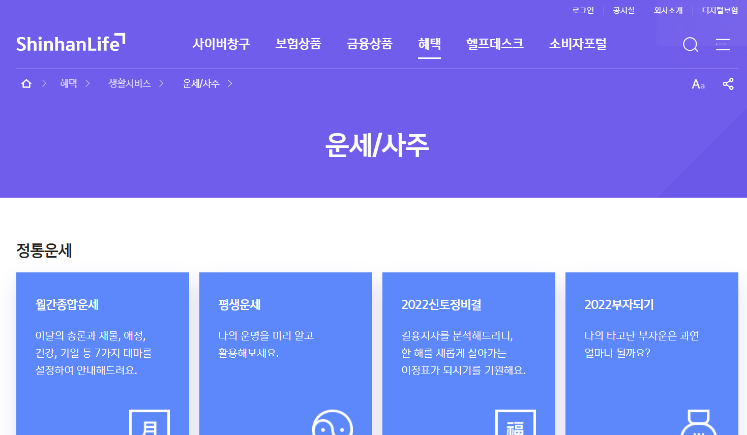 신한생명 무료운세는 많은 분들이 찾아보시는 사이트로 유명하며, 생각보다 잘 맞는 편이라 참고하기 좋다는 평을 받고 있습니다. 2023년 운세의 경우 12월부터 확인이 가능할 것으로 예상됩니다. 신토정비결 및 부자되기 뿐만 아니라 월간종합운세, 평생운세 서비스도 제공중이니 참고하시면 좋을 것 같습니다.