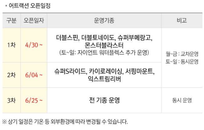 개장 예정인 곳부터 현재 운영중인 곳들이 많습니다. 간혹 어트랙션이 운영을 하지 않거나 풀장 청소를 하는 날이 있으니 휴무여부를 알아보시고 재밌는 물놀이 즐기시길 바랍니다.
